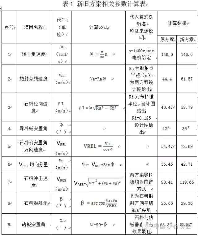 新舊方案的參數變化,導致了石料沖擊速度VRES和拋射角β的不同。為獲得佳的碰撞破碎效果,布置在機身腔壁的砧板的安置角α相應作調整。兩個方案相關參數的計算過程見表1。