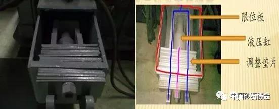 先松開調整墊片的固定螺釘,然后液壓缸動作,推動里面的彈簧,使反擊板與轉子的間距變小,將外面的墊片裝到里面,接著松開液壓缸,直至限位板卡著里面的墊片。