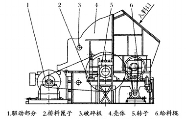在單段錘式破碎機運行過程中,大塊石頭物料進入破碎腔內,堆放在機器內特設的中間托架上,由在托架間隙中運行的破碎機錘頭擊碎而墜落,再經高速運轉的錘頭進一步打擊而細碎,符合尺寸規格的石料, 后經篦板均整合格后排出。