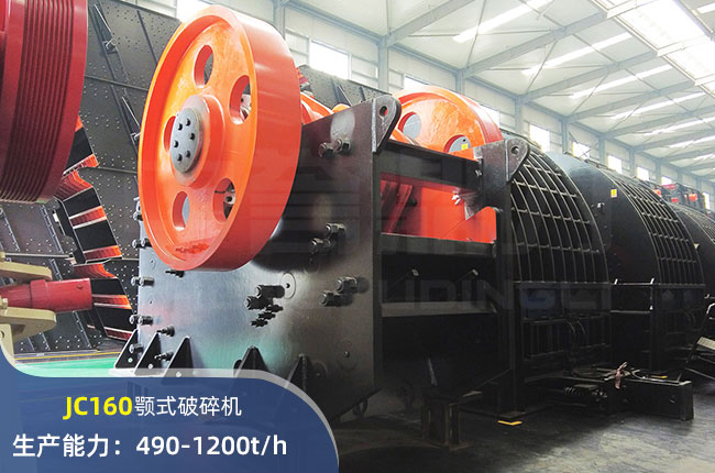 JC160顎式破碎機進料口尺寸在1600×1200mm,進料粒度≤1020mm,出料大小≤150mm,電機功率250kw,時產量在1200噸左右。