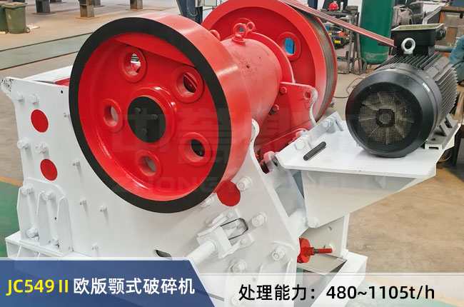 JC549II歐版顎式破碎機(jī)相進(jìn)料口寬1250mm,深1000mm,每小時(shí)產(chǎn)量480-1105噸,出料調(diào)節(jié)范圍在160-300mm之間,機(jī)器裸機(jī)重51.306噸,配置的是160-200kw的電機(jī)。