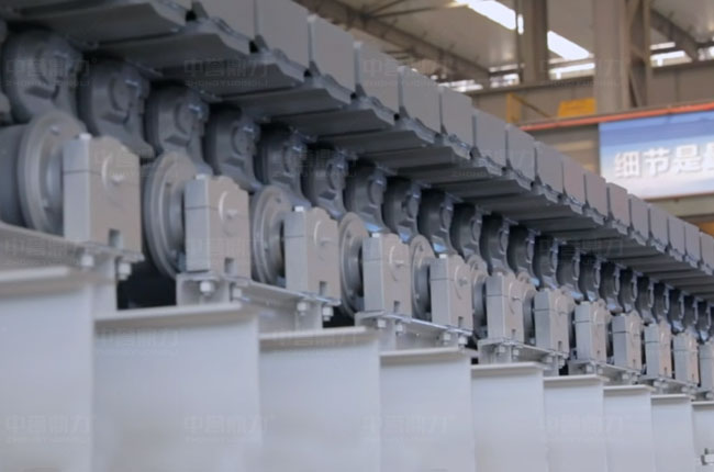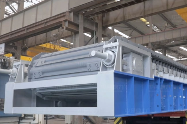 板式給料機的組成部分包括機架、主軸裝置、驅動裝置(電動機、聯軸器、減速器)、鏈板裝置、拉緊裝置、支重輪、托鏈輪等。