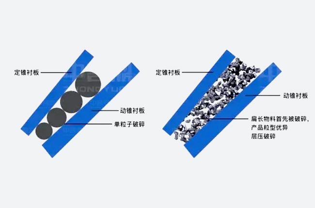粒間層壓破碎,合理利用物料間的相互擠壓,在提升破碎效率、成品比例的同時,較大程度上減少了傳統圓錐破針片狀含量大的問題,實現破碎粒度均勻、粒形、級配更合理。