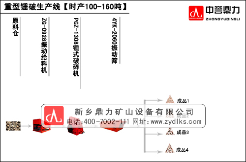 從山上爆破下來的石料,通過自卸車將600mm以下的石料送入振動給料機,振動給料機把石料均勻的送入重錘式破碎機,重錘破對石料進行破碎,通過圓振動篩分級篩分后,粒度不合要求的大塊物料通過輸送帶回到重錘破進行二段破碎,成品由皮帶機輸送至成品區(qū)。此石子生產(chǎn)線適合石灰石、青石、煤矸石、煤、礫石、片麻巖等抗壓強度不大于200Mpa的脆性物料,優(yōu)點是不需要如傳統(tǒng)的石子生產(chǎn)線一樣:鄂破+反擊破+圓錐破,只需要一臺重錘破就可以達到產(chǎn)量,破碎流程簡化,維護方便,節(jié)約生產(chǎn)成本。下面就100-160噸每小時的大產(chǎn)量石子生產(chǎn)線配置進行詳解。