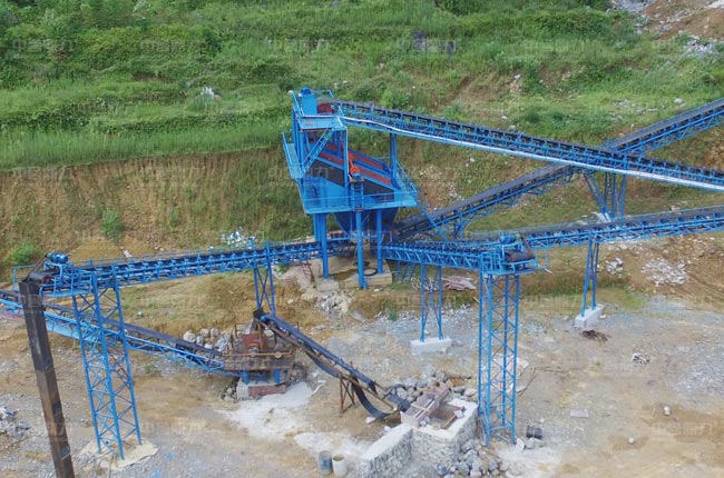 石灰巖物料硬度不高,采用PCZ1512重錘式破碎機,時產量250-320噸,一次破碎成型,不需要二級設備的投資,從PCZ1512重錘式破碎機破碎出來的物料可直接進篩機篩分出3種不同規格的成品石料。此種工藝配置簡單,投資小。