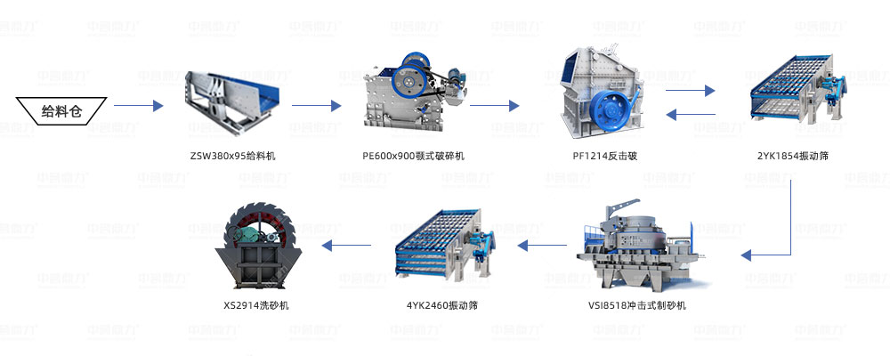 適合原料粒度較小,無(wú)需采用粗碎設(shè)備,直接中細(xì)碎加工后,通過(guò)制砂機(jī)制砂,投資相對(duì)要小些